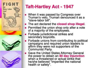 In the larger context, Taft-Hartley increased the power and rights of management while limiting all forms of workplace and economic democracy. Taft-Hartley was passed despite Truman’s veto by a powerful coalition of Democrats and Republicans. It’s the last major labor law “reform” this country has seen.