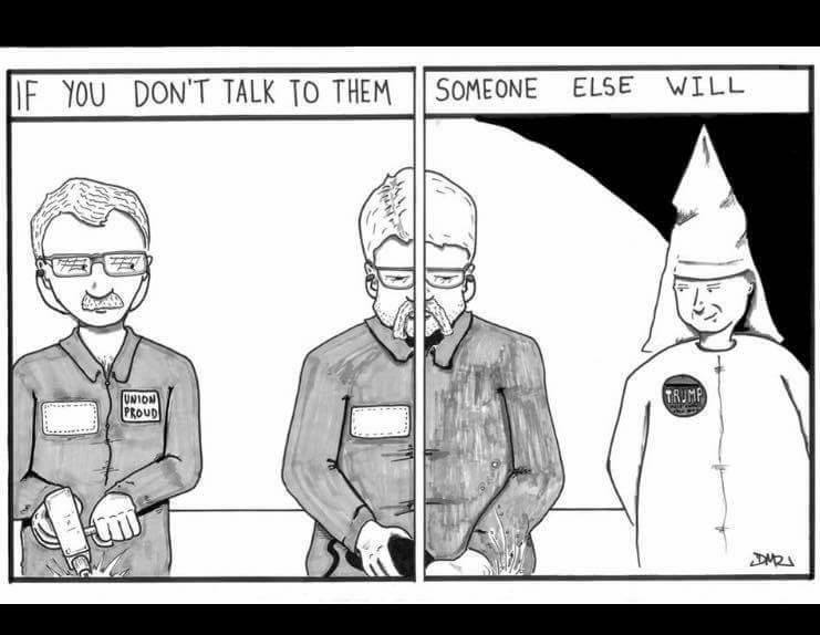 Eventually, we moved on but no matter where we went every workplace and every community was divided in some way. No exceptions. No matter how homogeneous it appeared, every workplace was divided. The should be no surprise since the boss’s first job is to divide and conquer– their profits depend on their power. Overcoming those divisions was our job. And we couldn’t do that by running away from trouble or taking shortcuts, like not talking with, and listening closely to, people we disagree with.
